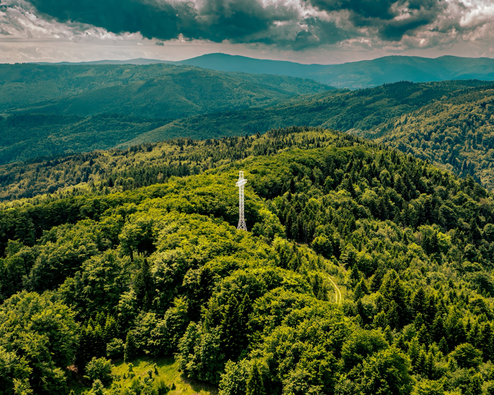Wartością tego obiektu nie jest wyłącznie skala, ale również jego umiejscowienie. Krzyż stanął w miejscu dawnej wieży triangulacyjnej, a więc przejął po wcześniejszym obiekcie funkcję mocnego punktu orientacyjnego. Jednocześnie między podporami konstrukcji przebiega granica Kóz i Międzybrodzia Bialskiego oraz dwóch powiatów: bielskiego i żywieckiego. W praktyce oznacza to, że krzyż nie tylko góruje nad okolicą, ale stoi dokładnie na styku różnych porządków: geograficznego, administracyjnego i symbolicznego.