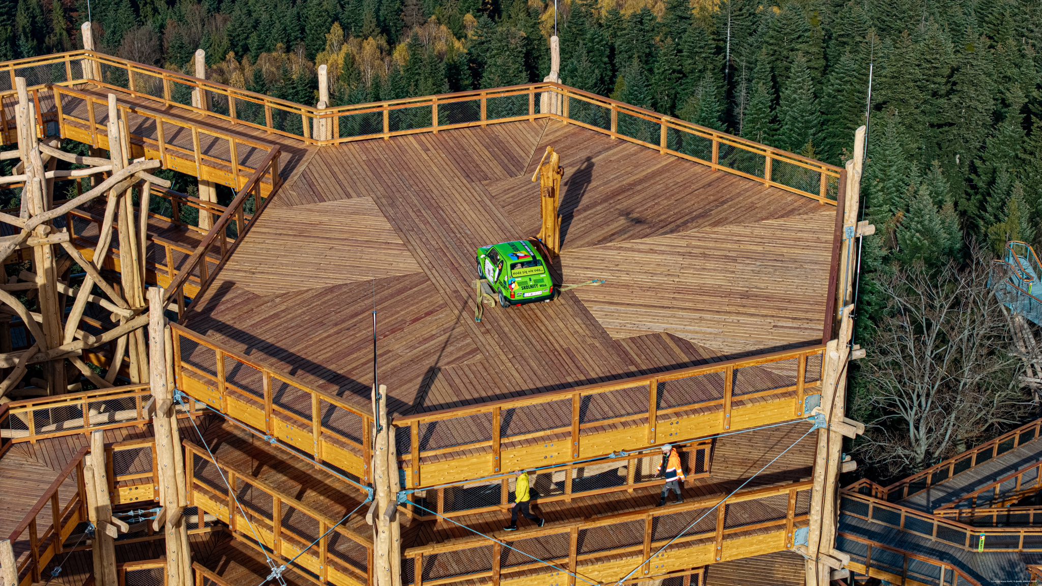 Dodatkowym elementem, który przyciąga uwagę na szczycie wieży, jest Fiat 126p umieszczony jako ciekawy akcent konstrukcyjny. Instalacja podkreśla charakter miejsca i stanowi wyróżniający punkt całej inwestycji.